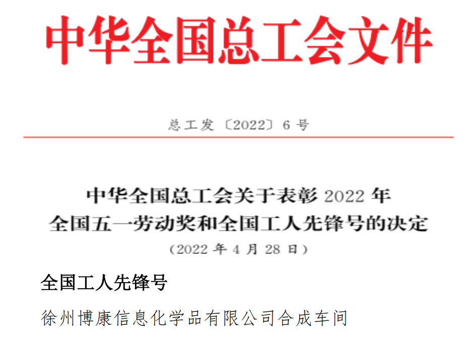 On April 28, the All-China Federation of Trade Unions issued the "Decision of the All-China Federation of Trade Unions on Commending the 2022 National May 1st Labor Award and the National Worker Pioneer" (Zonggongfa [2022] No. 6), which was awarded to Xuzhou B&C Chemical Co., Ltd. The honorary title of "National Worker Pioneer" in the company's synthesis workshop.